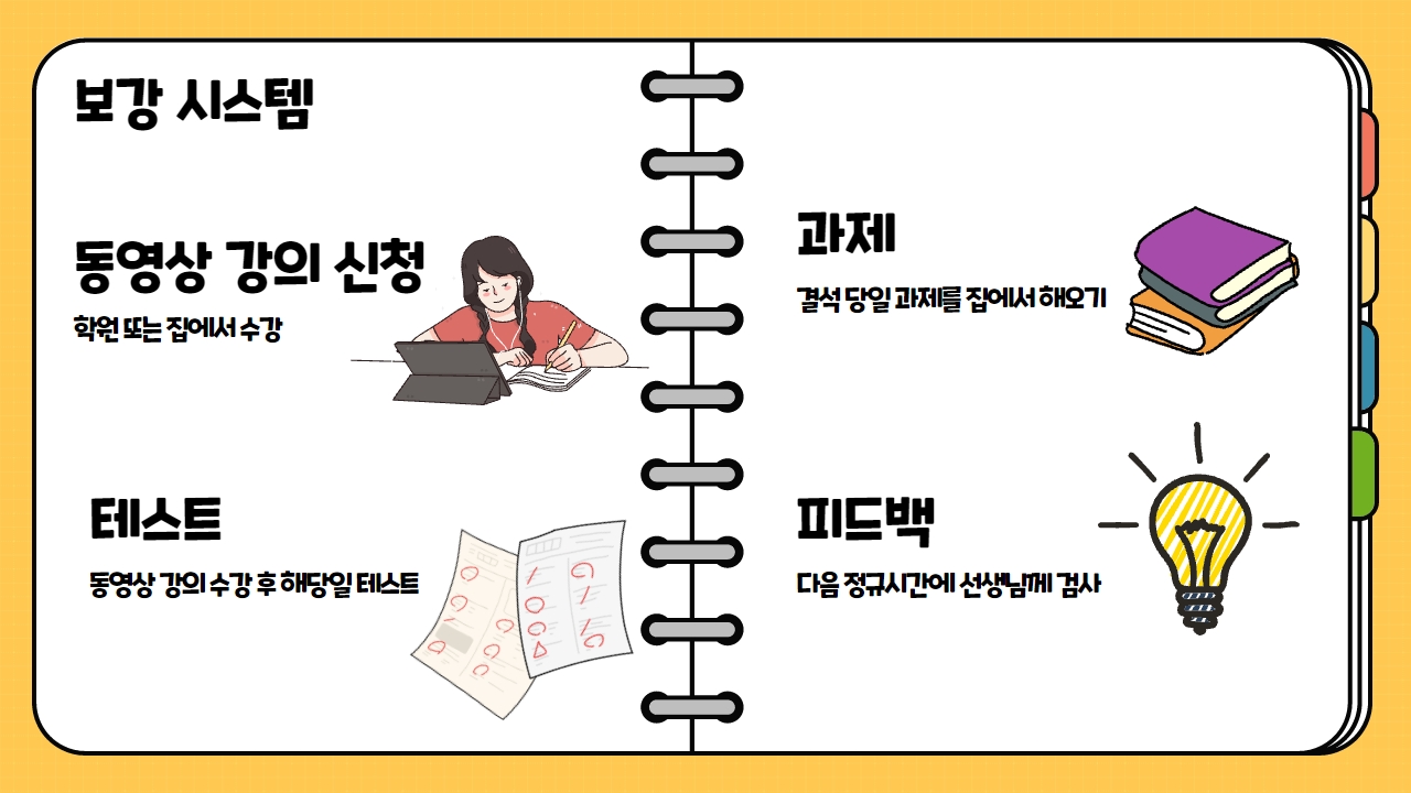 -결석시 동영상 보강은 필수입니다.(동영상 보강 수강료는 현장 수업료와 동일)